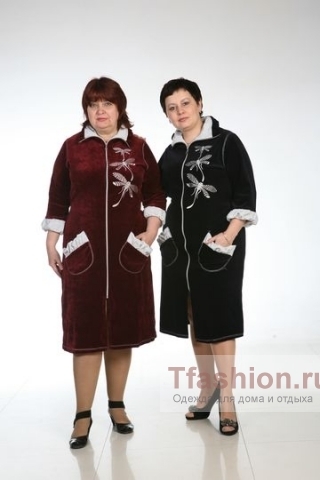 Комбинированный женский халат прямого силуэта с втачным рукавом 3/4 и отложным воротником , застегивается на молнию до концов воротника, превращая воротник в стойку . На полочках 2 накладных наклонных кармана округлой формы.На левой полочке вышивка -стрекоза.